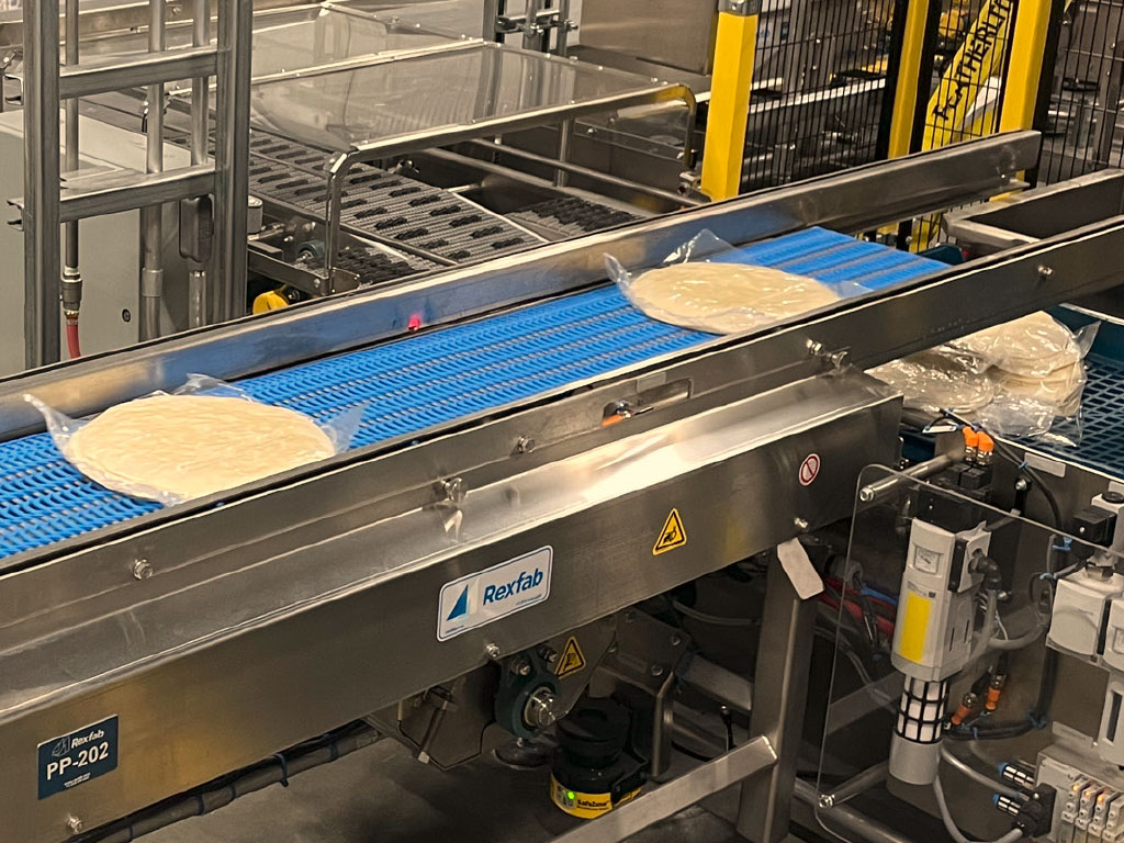 SERVO-DRIVEN RETRACTABLE CONVEYOR BELT THAT LOADS ALL TYPE OF FLAT BREADS IN MOVABLE BASKETS.